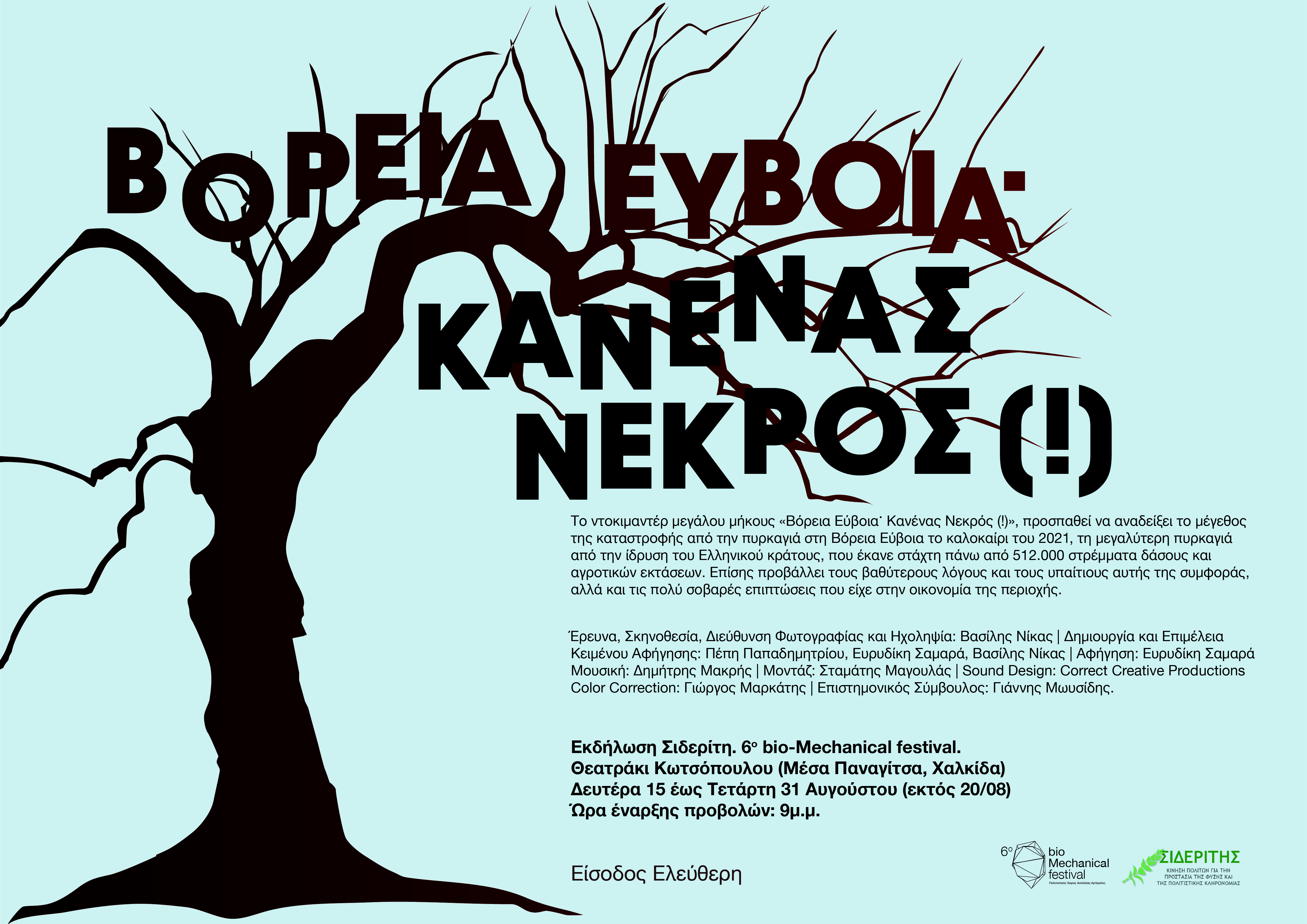 Από τις 15 έως τις 31 Αυγούστου (εκτός 20/8), θα πραγματοποιηθούν στο θέατρο Κωτσόπουλου (Μέσα Παναγίτσα, Χαλκίδα), οι προβολές του ντοκιμαντέρ μεγάλου μήκους «Βόρεια Εύβοια· Κανένας Νεκρός (!)», ως εκδήλωση του «Σιδερίτη» στα πλαίσια του bio-Mechanical festival.