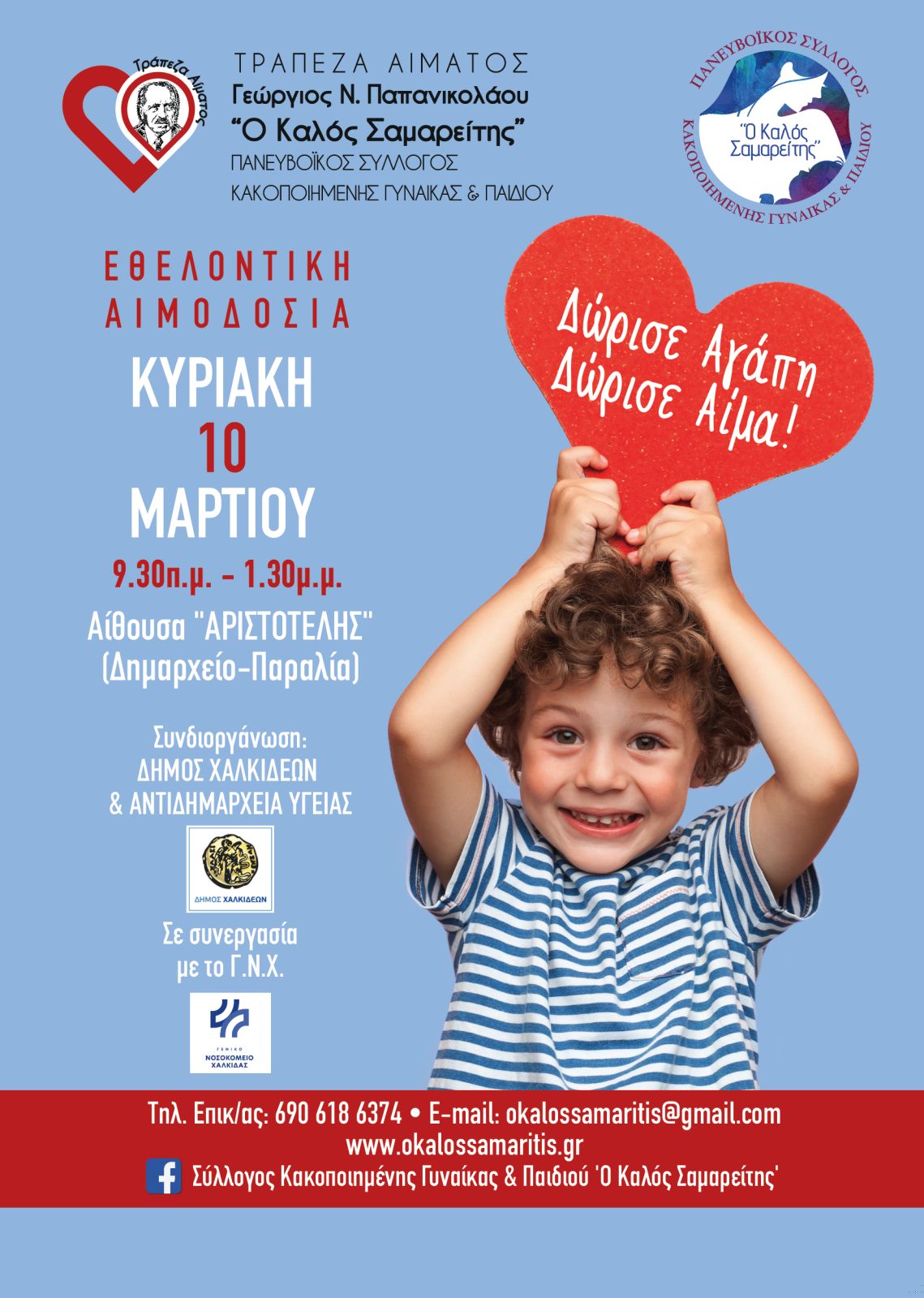 Εθελοντική αιμοδοσία από την τράπεζα αίματος Γεώργιος Ν. Παπανικολάου «Ο Καλός Σαμαρείτης» την Κυριακή 10 Μαρτίου από 09:30 έως 13:30 στην αίθουσα Αριστοτέλης (Δημαρχείο -Παραλία)